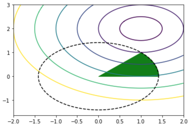 上図の緑の領域の中で目的関数の等高線が中心の紫に近い$(x_1,x_2)=(1,1)$が最適解である。また、最適解の$(1,1)$で等号が成立する制約条件を有効制約というが、この例では$c_1(\mathbf{x}) = x_1^2+x_2^2-2 \leq 0$と$c_2(\mathbf{x}) = -x_1+x_2 \leq 0$が対応する。